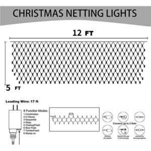 -Christmas Net Lights: Christmas 360 LED net lights, use UL-certified 29V low-voltage plugs to ensure the safe use of the product. The size is 12 FT X 5 FT, the lead length is 16.5FT, and the horizontal distance between each lamp bead is 4.7inch. Place or hang the exquisite net lights on the trees, grass, bushes or any place you want, very easy to decorate.