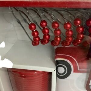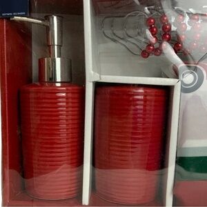 Easily revamp your entire bathroom for the holidays with this festive Holly Homes Santa Presents 15 piece shower set. This ensemble has everything you need in a nicely boxed set. Shower Curtain with 12 Matching Hooks and 2 Red Ceramic Vanity Accessories.