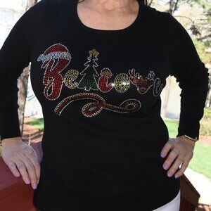 Custom made to order Christmas Believe rhinestone bling black long sleeved round neck shirt featuring a stunning vividly colored rhinestone design with lots of sparkle. If you like unique bling, this is the shirt for you. Also available in a Vneck, please message me if you prefer a Vneck.