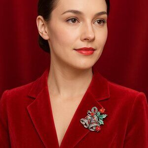 Christmas Bells Pin Brooch Silvertone Holly Rhinestones Red Green OS
