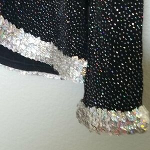 Unbranded. Super sparkly. Iridescent silver embellishment trims around the jacket and wrist. Black fabric with multi collred glitter specks. Beautiful red sequin beaded poinsetta. No fabric tag. not super thick or heavy. Had shoulder pads that could be removed. Somewhat of a shorter fit. Smoke free home. No size tag so see measurements. Great for evening wear, events, costume, glam, dinner, date night, pageant, recital, statement, vintage, retro