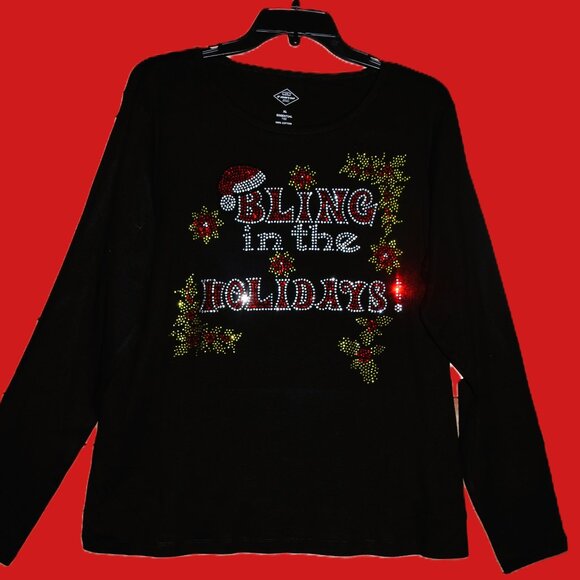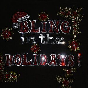 Custom made to order Christmas Bling in the Holidays rhinestone bling black long sleeved round neck shirt featuring a vivid ruby red, green and diamond clear rhinestone design with lots of sparkle! I also offer Vneck shirts if you prefer a round neck, message me.