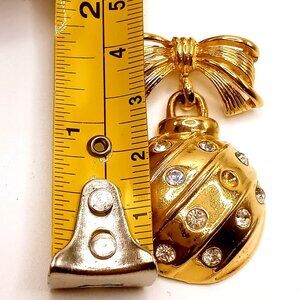 Christmas Brooch Bow & Ornament Gold Tone Metal Rhinestone Dangle Lapel Pin