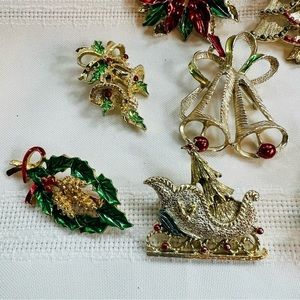 Beautiful vintage, nostalgic Christmas pins featuring rhinestones and enamel