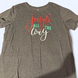 Light pink t-shirt with 'Merry + Bright' text in red.