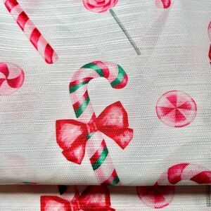 Brand new Christmas fabric shower curtain. The pattern is called Candy Cane Bows. On a white background there’s candy canes, lollipops and hard candies. Some of the candies have ribbon bows which adds a touch of sweetness to the pattern, It is 100% polyester and measures 72” x 72”.