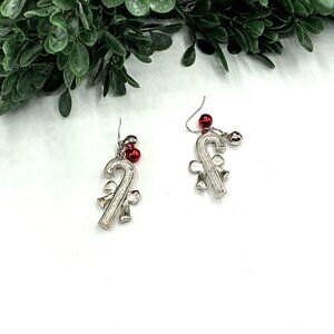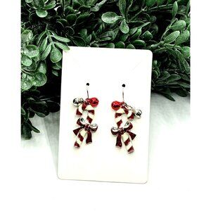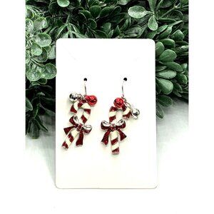 Christmas Candy Cane Dangle Earrings With Festive Red Bow and Bells