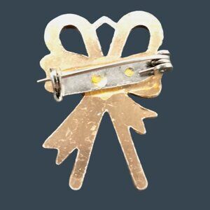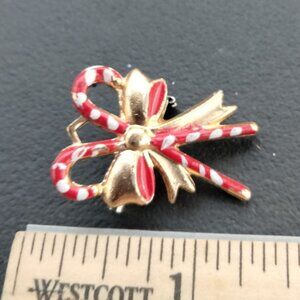 Christmas Candy Cane Pin Brooch Red Gold Bow Vintage Holiday Jewelry