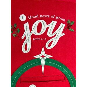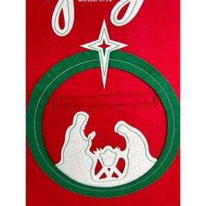 This Christmas Card Holder wall hanging features a festive nativity scene with the biblical verse Luke 2:10. Crafted from durable felt, it's perfect for adding a touch of holiday spirit to your home decor with its vibrant red and green colors. Has sleeve to insert Christmas cards