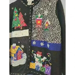 Christmas Cardigan Womens XL Black Knit Button Snowman Tree Plaid Beads Flaw