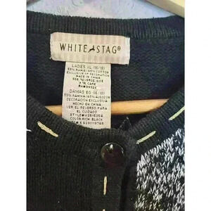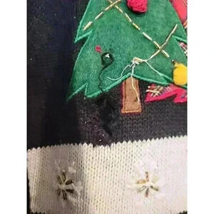 Beautiful knit beaded Christmas Cardigan sweater. Button up and size XL by White Stag. Has several loose beads and a hole right below the green tree. See pics for details. Sold as is. Can be covered with a brooch or large pin.