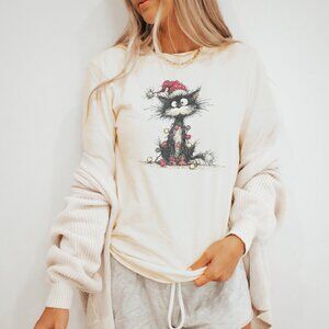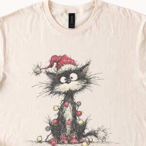 This playful design captures holiday chaos and kitty charm in one adorable tee This is a digital mockup please allow for minor differences in the final product