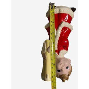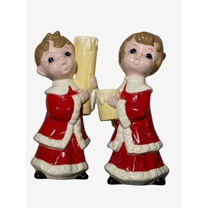 This vintage ceramic set features two charming children caroler figures in festive red and white outfits, holding spaces for candles. Perfect for seasonal decor.