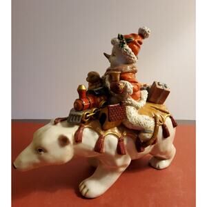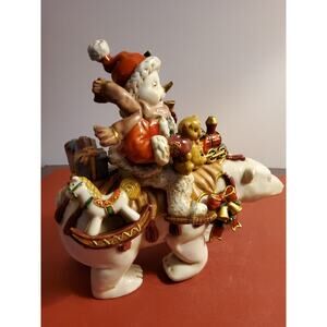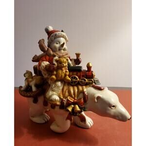 A collector style Christmas figurine with beautiful detail: Winter Child atop a polar bear with teddy bear, train, tassels and gold accents. This charming item is display worthy.