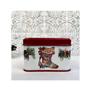 The tin is an off white with a dark red colored lid. The sides of the tin are decorated with a quilted stocking and greenery. The bottom of the tin is marked Potpourri Press © 1987. The coaster set does not appear to have ever been used, as it is still in sealed plastic. They are an of white color, with a dark red colored trim around the edge. The center of the coaster is decorated with the same stocking that is on the tin.