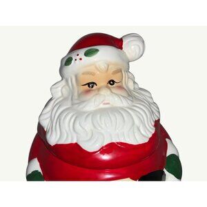 This vintage ceramic Santa Claus cookie jar serves as both a functional and decorative piece for the holiday season. Its detailed design and vibrant colors make it an eye-catching addition to your kitchen or living space. A charming way to store cookies or festive treats while adding holiday cheer.