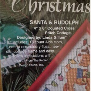 Christmas Cottage Santa & Rudolph 4x 6 counted cross stitch kit. This unopened kit, from 1995 for Bucilla by Linda Gillum is 4 " x 6" and includes 18 count Aida Cloth (this is a nice weave size) cotton embroidery thread, needle, instructions and an adorable plastic frame. This kit will stitch up quickly given the small size. It is kit #33492.