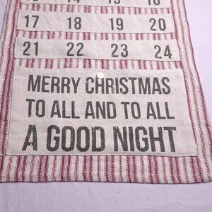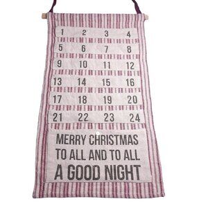 This delightful wall hanging invites the spirit of Christmas into your home. With its charming striped design and countdown slots, it becomes your family's festive tradition. Tuck little surprises into the pocket below, spreading joy each day until Christmas. A rustic, cheerful addition to your holiday decor.