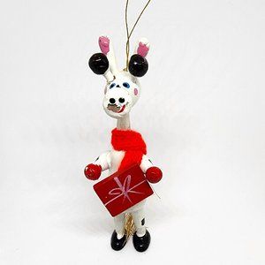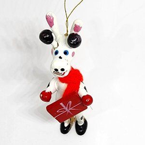 This wonderful vintage wooden standing white with black spots Cow is holding a red package, wearing a red cloth scarf and has a wonderful little straw brush tail.