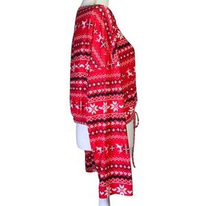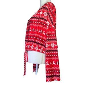 Christmas Holiday Crop Top Women’s Long Sleeve Tie Front Festive Modern Ugly Sweater Party Tee Blouse Shirt Contemporary Flirty Modern Flair with a soft Stretchy Comfy Material Red White Reindeer Snowflake Fair Isle Print 1XL