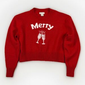 Christmas Cropped Sweater “Merry” Champagne Wool Blend Red Women’s Sz M Holiday