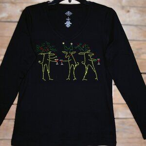 Custom made to order Christmas Reindeer sharing a toast rhinestone bling black long sleeved round neck shirt featuring a beautiful rhinestone design with lots of sparkle. If you like unique bling, this is the shirt for you. This design features lots of sparkling spring green & emerald green, red, gold and diamond clear rhinestones. So fun!