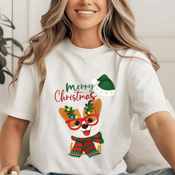 Christmas Dog T-Shirt , Cute Corgi with Santa Hat, Lights, and Scarf White