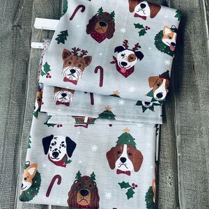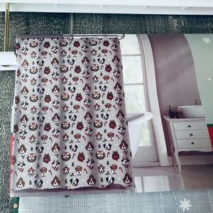 NWT adorable Christmas dogs with holly and candy canes print holiday textured fabric shower curtain. Gray background.