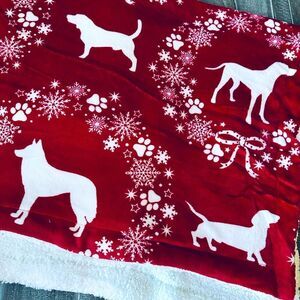 NWT plush Sherpa pet bedding throw blanket. Super soft and cozy, red and white color with dogs and snowflakes print, solid bright white Sherpa reverse. 40x50”.