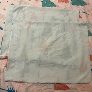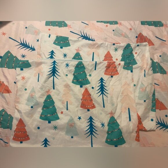 Pillow cases and duvet cover are one side Christmas trees Orin and the o the side is baby blue colour.