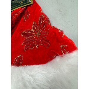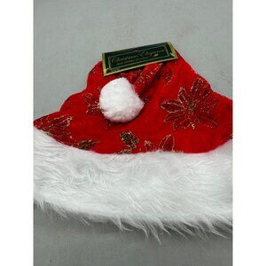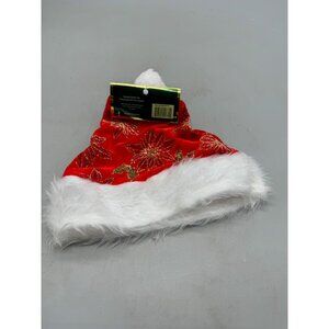 This Santa hat from Christmas Elegance is a festive addition to holiday attire. Its red and white design is adorned with glittery poinsettia accents, providing a touch of sparkle. The plush white trim and pom-pom detail enhance its classic look. Ideal for holiday parties or seasonal celebrations.