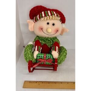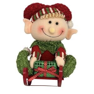 * Based on the image provided, the item is a plush Christmas elf decoration sitting on a red sled and holding a present. Similar holiday figurines are available from various retailers, with many designs and styles available for purchase.