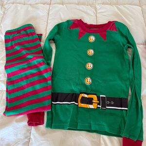Festive Christmas pajama set featuring elf and Santa designs. Includes green and red colors.