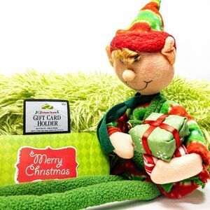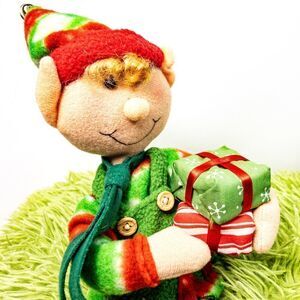 Made of poly material and sand, and dressed in red and green fleece with jingle bells on top and toes..