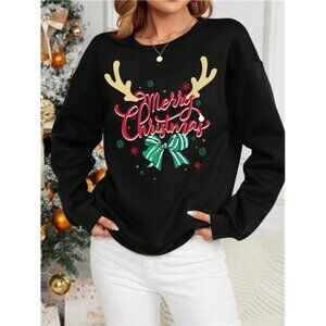 Christmas Elk Antler Imitation Pearl Bow Decor Print Long Sleeve Sweatshirt