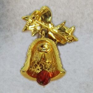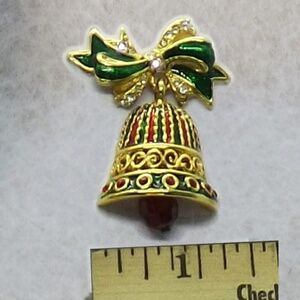This Christmas brooch features a gold-tone bell adorned with red and green enamel stripes and clear rhinestones. It has a bow on top, also with red and green enamel and clear rhinestones. The brooch measures 2.5 x 1.25 inches and has a pin closure.