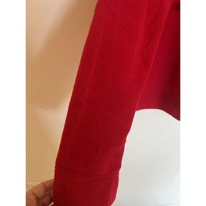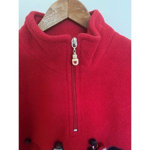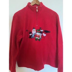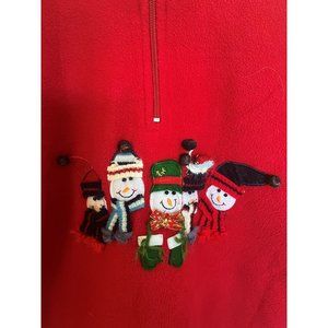 Cute appliqued Christmas snowmen characters with hats. Preowned. Good condition.Pullover 1/4 zipper. Polyester. 24" pit to pit. 22" sleeve. 25" shoulder to hem. Little bit of pilling.