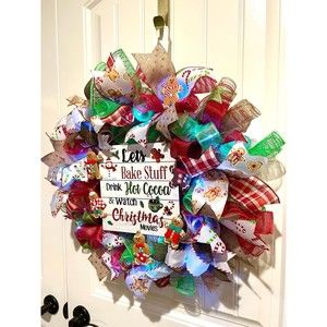 About 22 inches, 5 inch-deep door or mantle wreath. Red, Burlap, and green mesh back. December/ Christmas themed w/ vibrant multi color wired ribbons (9 styles). “Let’s Bake Stuff Drink Hot Cocoa …” Wooden sign, and matching gingerbread men adorn this festive wreath.