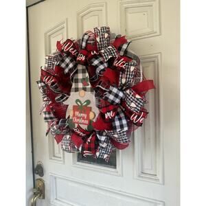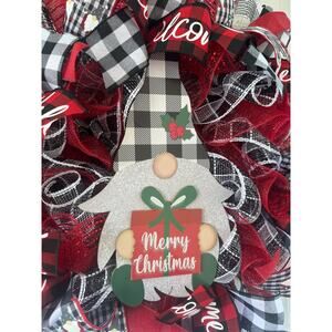 Add some whimsical charm to your holiday décor with this adorable Christmas gnome wreath! Featuring a cheerful gnome holding a “Merry Christmas” sign, surrounded by festive buffalo plaid ribbons and rich red accents, this wreath is perfect for bringing the magic of the season to your home.