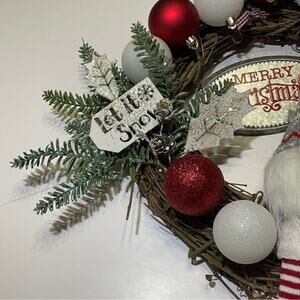 Grapevine wreath red and white decorations. Gnome at the bottom. Merry Christmas metal sign at the top. Please see pics for measurements.