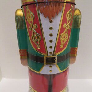 Christmas Green Nutcracker Tin Can with Hat Lid, Empty Container, The Silver Crane Co., Chocolate Truffles Not Included. A beautiful festive container to display during the Christmas season. Airtight storage for your favorite savory nuts and sweet candies. Whimsical big tooth mouth, curly mustache, beard and vibrant colorful uniform. Fill up with treats and top off with hat lid. A delightful holiday décor.