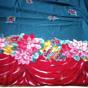 Green and red rectangular Christmas tablecloth measures 52 by 102 inches. It has holly and berries throughout the center and the border is of various poinsettias.