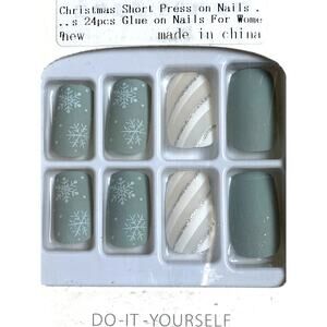 Christmas Green White Snowflakes Tan White Striped 24pc Set Glue on Nails