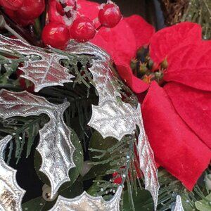 Brighten your door and wall colors with this handmade green ,red and white Silver poinsettia Christmas wreath ,It will pop your door or wall color and bring it to life, using different material to create this unique elegant piece .Perfect wreath for your wall and front door or a gift for a special person .Decorate for your Christmas day with this cute red and silver wreath and let your door stand out .