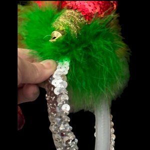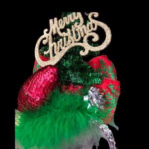 “Behold the festive headpiece that will make you the star of the holiday party! This headband is a true masterpiece, crafted with care and attention to detail. The centerpiece of the headband is a glittering Merry Christmas sign that sparkles in the light, surrounded by shimmering green feathers that sway with every movement. The sign is flanked by sequenced Christmas light bulbs that twinkle and glow, casting a warm and inviting aura around you. The headband is adorned with a glitter wired ribbon bow that adds a touch of elegance and sophistication to the design. And let’s not forget the tencle green Christmas tree that sits atop the headband, complete with silver sequenced headband that adds a touch of glamour and style. The color scheme of the headband is a perfect blend of red and green, evoking the spirit of Christmas and the joy of the holiday season. Wear this headband to your next holiday party or ugly sweater party and watch as heads turn and jaws drop in awe. It’s the perfect accessory for anyone who wants to spread some holiday cheer and look fabulous while doing it!”