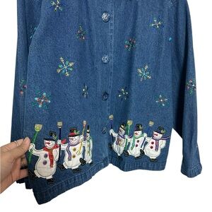 Christmas Holiday 100% Cotton Denim Blue Jacket Snowman Snowflake | Size Medium