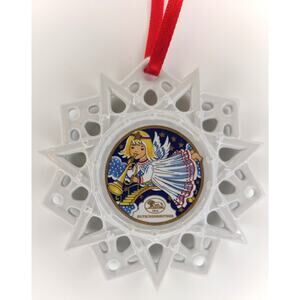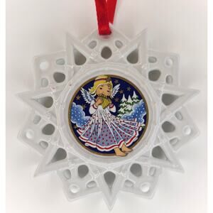 Schmuckstern, white porcelain, snowflake-shaped, Christmas/holiday ornament with an angel on each side (one with a panflute, one with a trumpet). Ornament is 3" in diameter. Used. Perfect condition. In an opened original box.