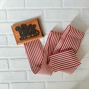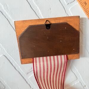 Christmas Holiday Card Holder Brown Sleigh Wooden Topper Red Striped Ribbon
