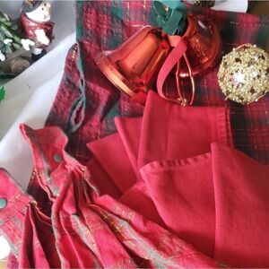 Gently used 45x45" square red plaid tablecloth, 8 red 18x18" linen napkins, and 2 14" hanging hand towels with button detail in red plaid. Bells not included.