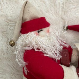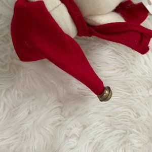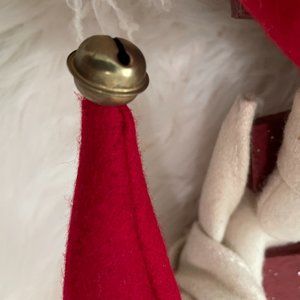 soft stuffed Santa and Snowmen wearing winter scarves and hats with bells attached to HoHoHo sign